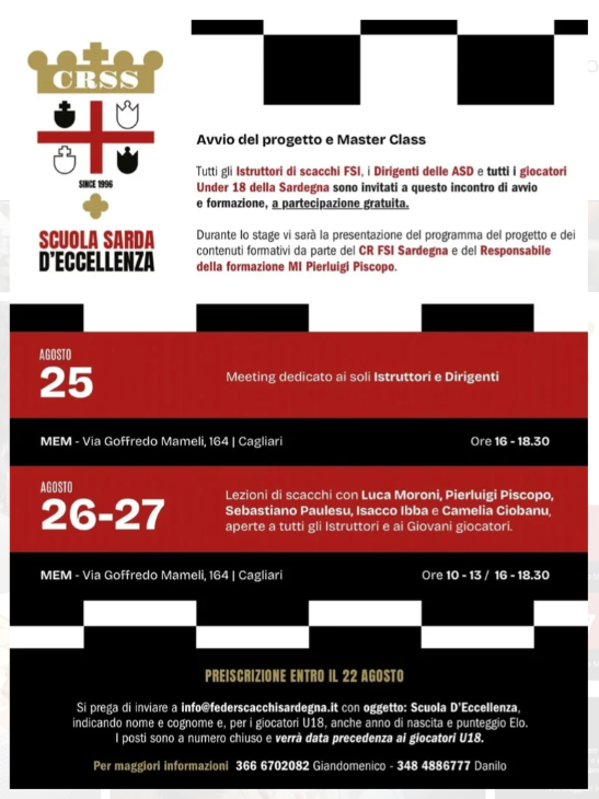 Gli scacchi sono la palestra per eccellenza della mente, un simbolo universale di strategia, pazienza e acume intellettuale. Ma cosa succede quando questo nobile gioco diventa il fulcro di un progetto che unisce formazione d’élite, crescita personale e un forte radicamento nel territorio? Una risposta si cerca di darla in Sardegna con la “Scuola Sarda di eccellenza“, una formazione gratuita organizzata dal Comitato Regionale Scacchi Sardegna per giovani talenti sardi, con lezioni di grandi maestri per migliorare le abilità negli scacchi. Il progetto, finanziato dalla Regione Autonoma della Sardegna, ha visto per ora due incontri recenti a Cagliari (agosto 2025)