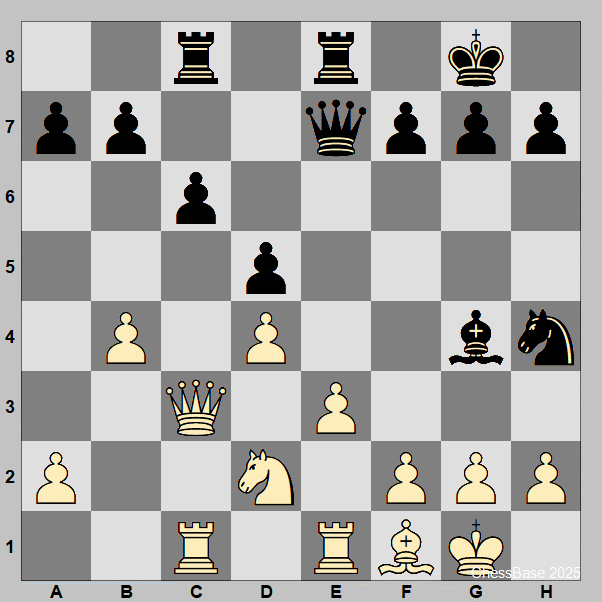 Dopo la diciottesima mossa del Nero (18… Dg5), la situazione è tesa. Il commento al diagramma è eloquente: “Il Nero ha chiaramente superato il suo avversario creando minacce.” Con la donna in g5 e l’alfiere in h4, il Nero minaccia di sfondare sul lato di re, costringendo il Bianco a risposte difensive precise che consumano tempo ed energie. Il Nero non si è accontentato di una posizione “buona”, ma ha iniziato a creare problemi attivi. L’analisi prosegue notando che anche dopo la migliore risposta del Bianco, 20. f3, “il Nero mantiene l’iniziativa con 20… Ah3!”.