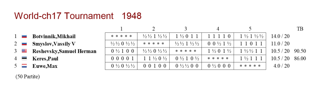 Il torneo-match per il Campionato del Mondo del 1948, che vide Botvinnik incoronato, fu l’evento emblematico di questo periodo, con Reshevsky unico rappresentante del mondo non sovietico a lottare per la corona.