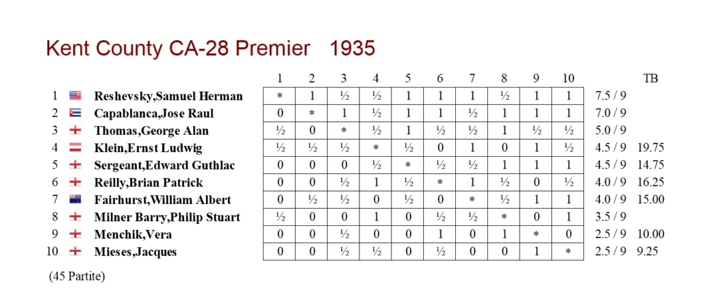 L’ingresso ufficiale di Reshevsky nell’élite mondiale avvenne con la sua vittoria al torneo di Kent County nel 1935, dove si classificò davanti alla leggenda vivente José Raúl Capablanca. Questo successo non fu solo una vittoria prestigiosa, ma un momento di svolta.