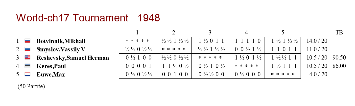 Il torneo-match per il Campionato del Mondo del 1948, che vide Botvinnik incoronato, fu l’evento emblematico di questo periodo, con Reshevsky unico rappresentante del mondo non sovietico a lottare per la corona.