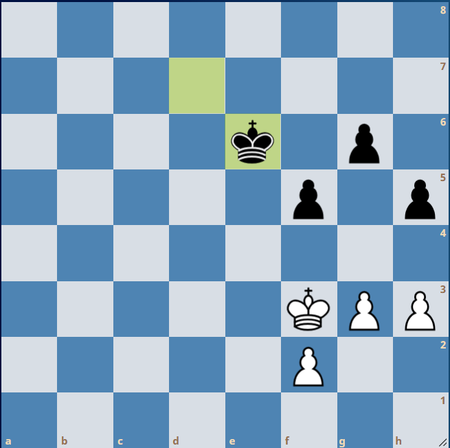 Il secondo e decisivo tempo di riserva. Il Nero è ora in Zugzwang. È costretto a muovere il Re, ma qualsiasi sua mossa permetterà al Re bianco di vincere l’opposizione e decidere la partita.